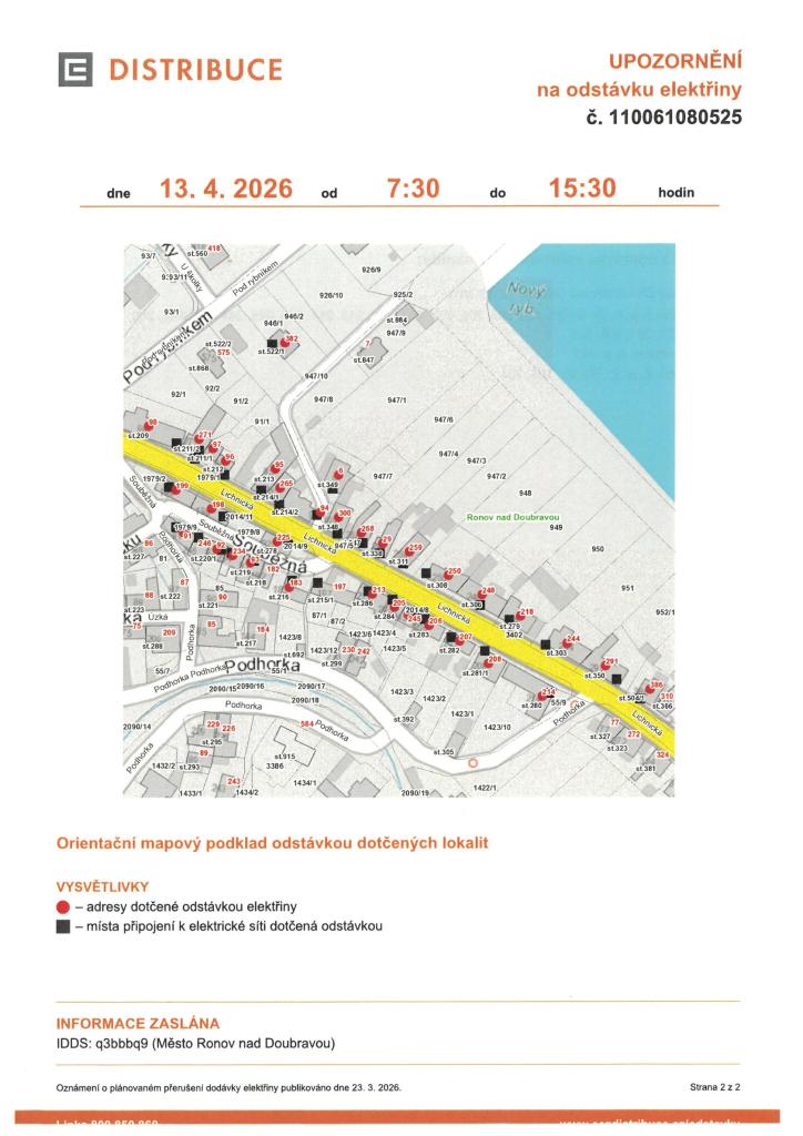 Distribuce ČEZ upozorňuje na odstávku elektřiny v pondělí 13.4. od 7:30 do 15.30 v ulici Lichnická, Souběžná, Pod Rybníkem.