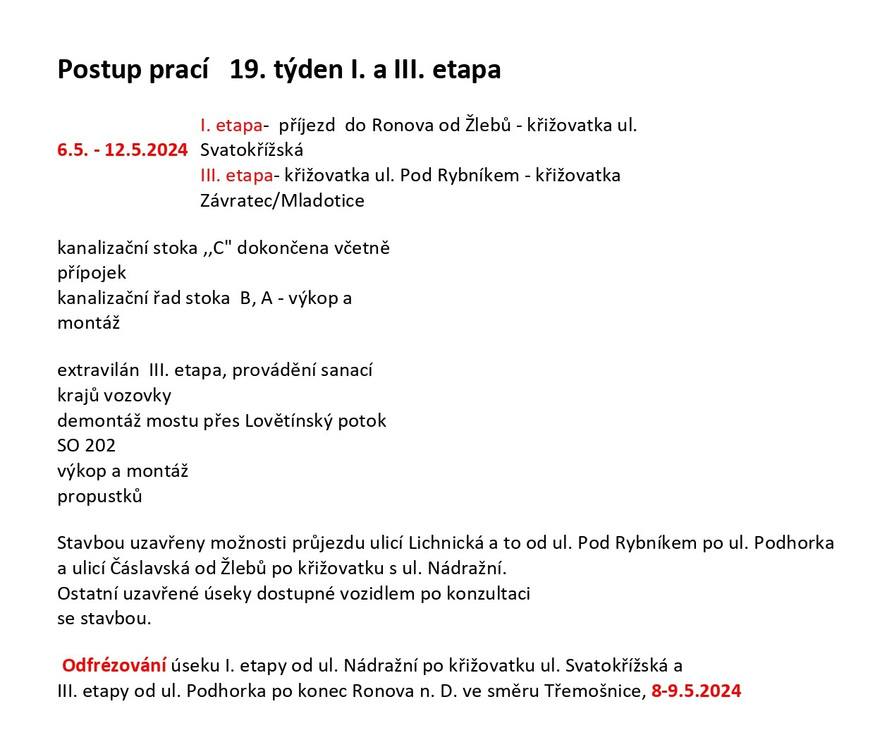 – III. etapa (úsek stavby) – od 02.04.2024 do 09.09.2024 – v úseku od křižovatky s místní komunikací (dále jen „MK“) v ulici Pod Rybníkem po křižovatku se silnicí III/337 40 v místní části Závratec obce Třemošnice